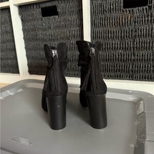 Elegant black suede booties with a stylish peep-toe. Ideal for any occasion.