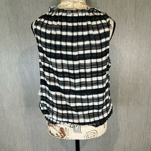 Chic checkered blouse with a ruffled neckline. Lightweight and stylish for versatile wear.