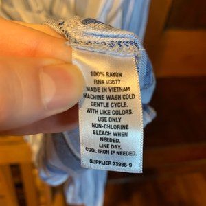 You will wow in this lightweight tie-front crop top by a.n.a. Predominantly baby blue in color with white, black and darker blue vertical stripes. Super flattering! Small periwinkle blue buttons down the front. 100% Rayon. Machine Wash Cold Gentle Cycle.