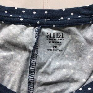a.n.a. blue and white polka dot long sleeve crew neck shirt. Size 2X. Made of a cotton / modal / spandex blend. Great condition. No rips, holes or stains. Smoke free home.