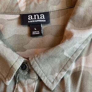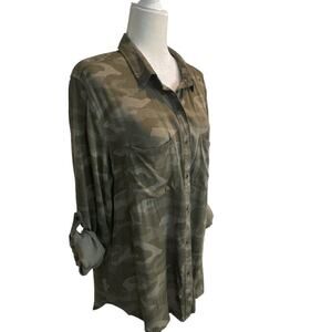 a.n.a. Camo Roll Tab Sleeve Button Up Flowy Tunic High Low Top Blouse Size Large