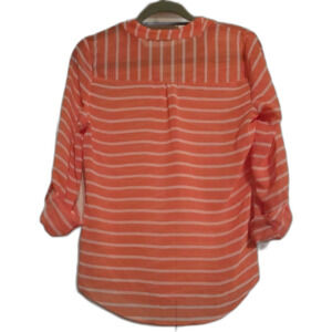 Chic coral and white striped blouse. Features button-up front and roll-tab sleeves. Perfect for casual outings.