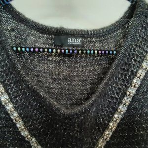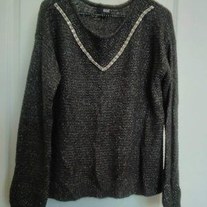 A NEW APPROACH Women's Gray Knit Sweater. Dark grey with silver threads make this a gorgeous sweater. Embellishment around the neckline in a V shape. Very Soft.