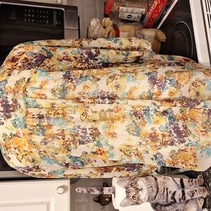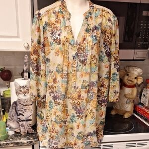 Stylish blouse with abstract patterns. Features a blend of warm and cool tones. Ideal for versatile styling.