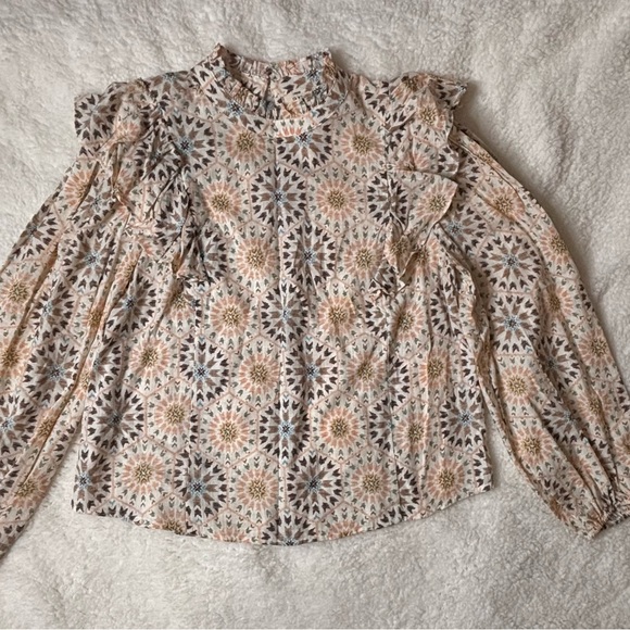 Chic blouse with intricate patterns. Features ruffle accents and long sleeves. Ideal for a stylish ensemble.