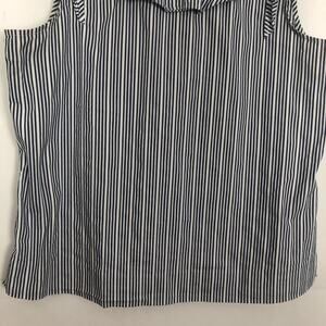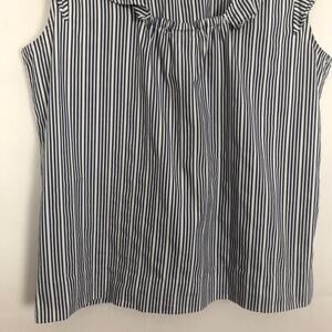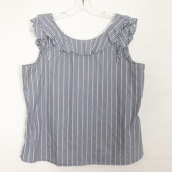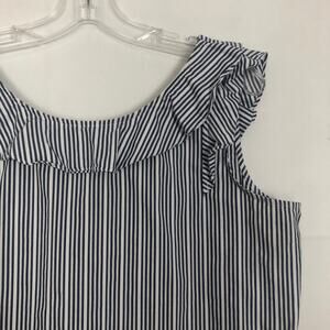 a.n.a striped top in blue and white. Scoop neck. Sleeveless. Ruffled wide straps and neckline. In good used condition. No visible flaws.