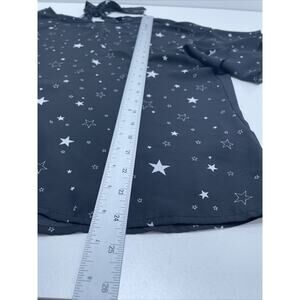 Black blouse, flutter ruffle bell short sleeves, tie back, all over graphic star print, black base with white accent