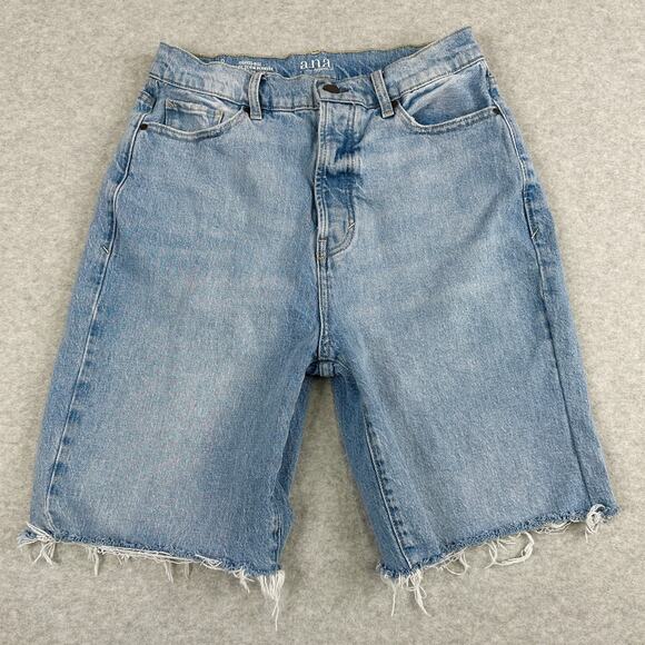 a.n.a. Denim Bermuda Shorts Women’s Size 8 – Light Blue Wash, High-Rise Waist, 90s-Inspired Style, 9-Inch Inseam, Button Fly Closure, Classic 5-Pocket Design, Soft Stretch Denim, Relaxed Fit, Vintage Look, Frayed hem, Casual Summer Staple, Everyday Wear or Retro Street Style.