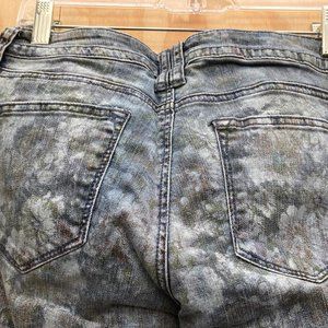 Waist 28", Inseam 29", 5.25" across bottom hem, 35" hip, blue floral stretch jeggings, jean pocket.