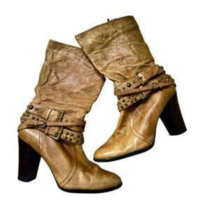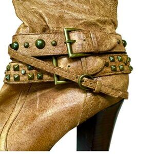 Step out in style with these tan heeled boots. Featuring a chic criss-cross buckle design and studs, they add an edgy touch to any outfit.