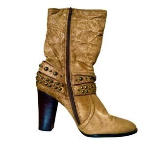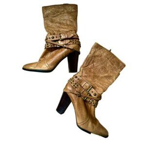 a.n.a | Tan Heeled Leather Boots Buckle & Stud Detail, Western Cowboy Vibe, 9M