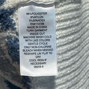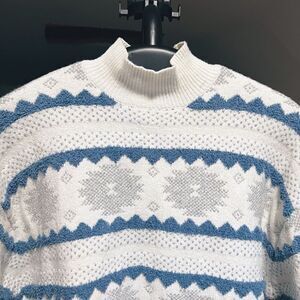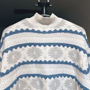 This cozy a.n.a sweater in size 2X features a beautiful “Whisper” pattern with blue and ivory tones, adding a touch of rustic charm to any wardrobe. The sweater has a mock neck and a relaxed fit, making it perfect for layering during the cooler seasons. Crafted from a soft polyester blend, this piece offers comfort and warmth with a stylish design.