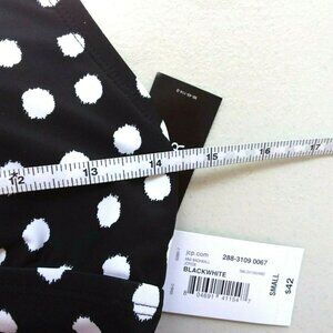 NWT a.n.a. women's black with white polka dots tankini top. Adjustable straps. Removable padding. See photos for measurements and material content. All measurements were taken with the garment lying flat.