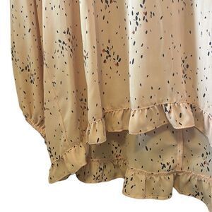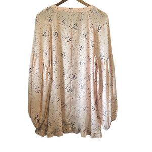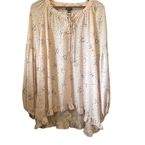 Keywords: a.n.a blouse, womens top, pink blouse, black print, long sleeve blouse, flowy top, tie neck blouse, ruffled hem, hi low hem, casual blouse, bohemian style, boho top, size large, L, loose fit
