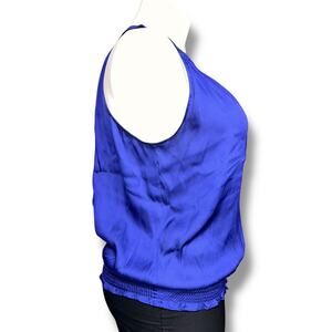 ana Womens Blouse Shirt Top Satin Halter Top Smocked Bubble Hem Blue Purple Lar