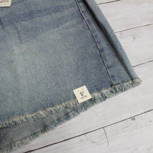 These denim blue short have a zipper front with raw hems. They are really nice quality and are brand new with tags.