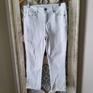 Grab this white distressed jean with embroidered & raw hem detail now.
