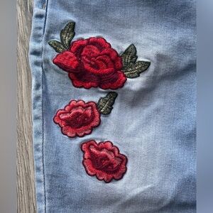 Stylish light blue cropped jeans. Features vibrant floral embroidery. Perfect for casual wear. Super cute!!