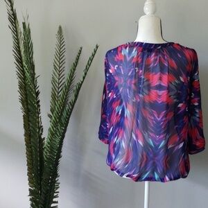 Fantastic shades of red, blue, purple, and green decorate this sheer blouse. The straight collar vees down to a tucked front. An elasticized hem completes this fun print top.