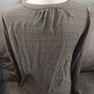 Chic & stylish olive green, long sleeve, button-up blouse with flattering criss-cross design. Lightweight and perfect for any setting.