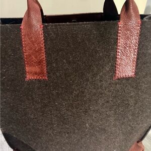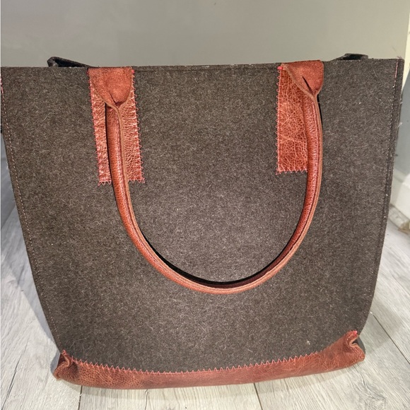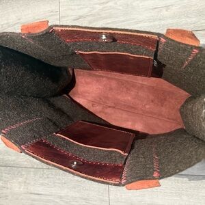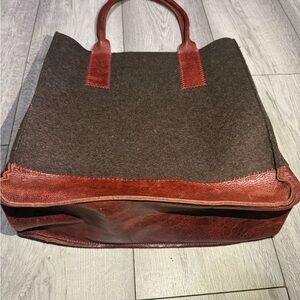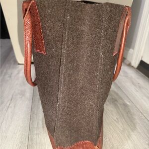 Tote bag wool blend- cognac leather sophisticated brown and tan design. Computer or summer/winter.