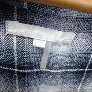 and'or vogue women's crossover top black/white/blue plaid 3/4 sleeve. S. Small. Rayon. Pit-p 22" length 31". 92pm
