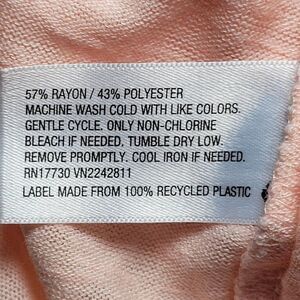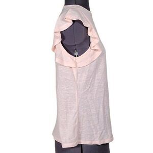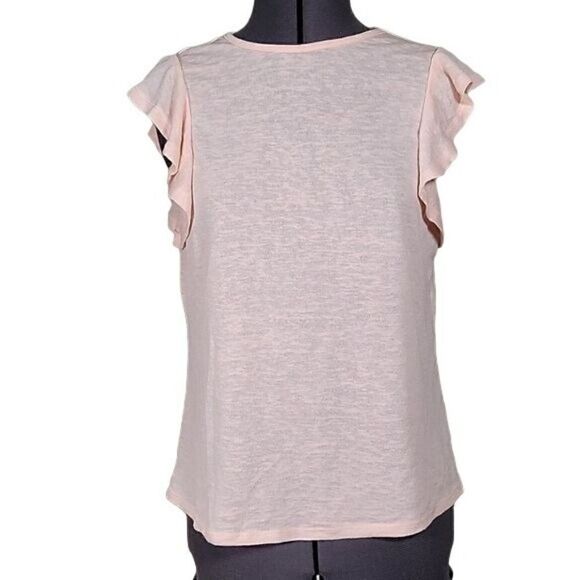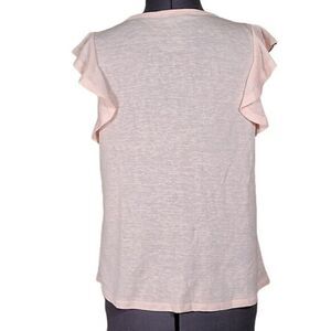 This pale pink knit top from a new day is sheer with ruffles as cap sleeves. Content: 57% rayon, 43% polyester. Care: machine wash, tumble dry.
