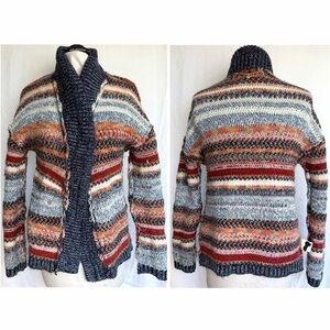 Very Nice and Cozy Women's Small Chunky Sweater Knit Cardigan by Knitted & Knotted for Anthropologie. Beautiful Intarsia Knit Stripe Pattern is stunning with the solid blue Shawl Collar and Trim along front sides, lower sleeves and hem.