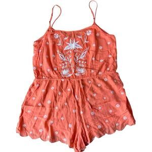 anthropologie coral Orange strappy romper embroidered boho scalloped hem small