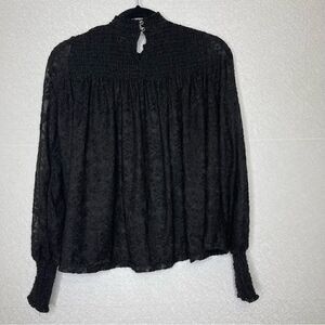 •Features: Black long sleeve lace top with mock neck. Keyhole back with double button closure. Top is sheer/see through.