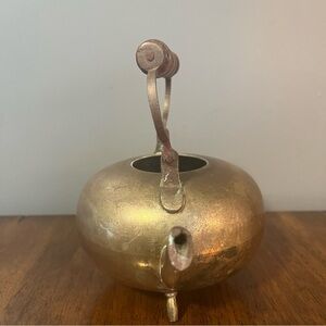 antique brass kettle with a wooden handle and three-legged base.