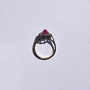 Beautiful, antique ring with a cabochon-cut ruby surrounded by 8 white diamonds, set in 9k yellow gold. The ruby is such a pretty, deep shade of pink and the diamonds are very sparkly. The stones are natural. The interior of the band is hallmarked 375.
