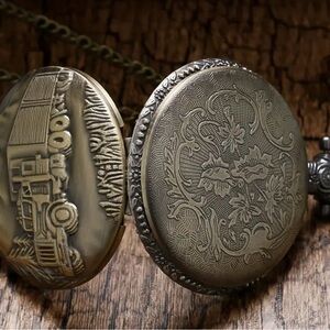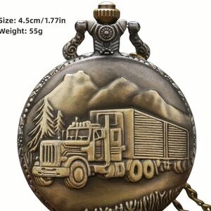 Beautiful antique style pocket watch with a bronze finish and a truck design on the front. It has a brass chain and a silver-tone bezel. watch #trucker