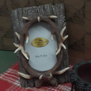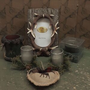 Rustic deer antler tree bark 4X6 picture frame and pinecone deer antler catch all container. also comes with a new home sense winter Pine candle in a jar a Moose Country burlap Christmas ornament and two battery operated votive candles with real style Pine candle rings just a beautiful gift pack for the cabin or rustic home.