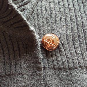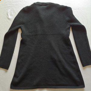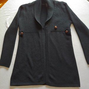 picturing long black cardigan w/ brown buttons apostrophe shrug