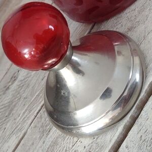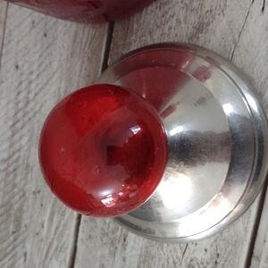 Deep red, etched glass with silver metal lid with large red glass ball on top.