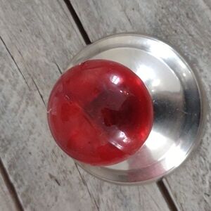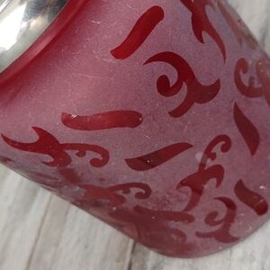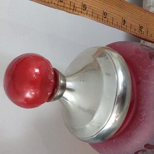 Deep red, etched glass with silver metal lid with large red glass ball on top.