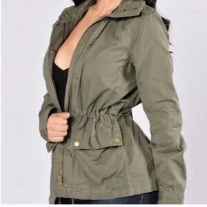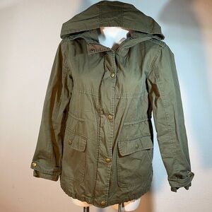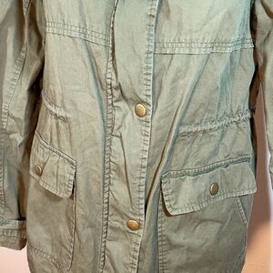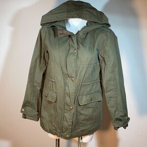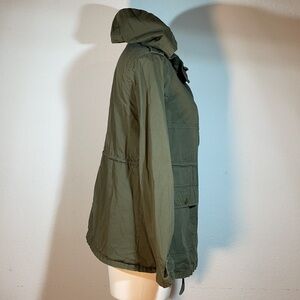 ark & co olive green, long hooded cargo jacket with a draw string waist. Medium