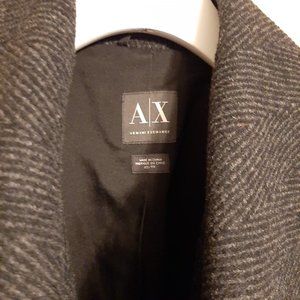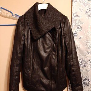 hard to describe the fabric (a mix of leather, subtle sheen, and matte texture). front collar is wool and drapes nicely. wear it two ways! TTS and EUC.
