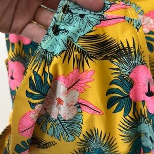 Bright yellow one piece with vibrant pink and green floral design. Short sleeves. Perfect for swimming.