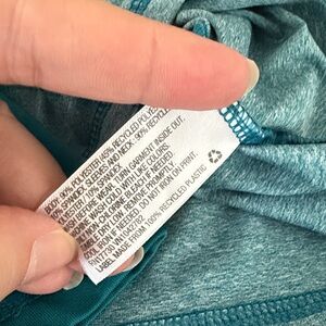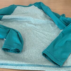 Light teal body with darker teal raglan sleeves. Soft, stretchy swim fabric. UPF sun protection for beach or pool. Simple wave logo detail on chest. 6/7