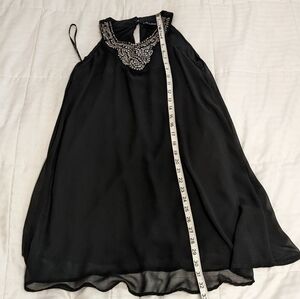 As U Wish mini A-line sheath dress size Extra Small XS. pretty beading around the neck line with a 2 button closure on the back neck with a keyhole on the back also.