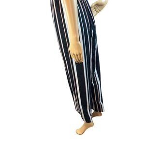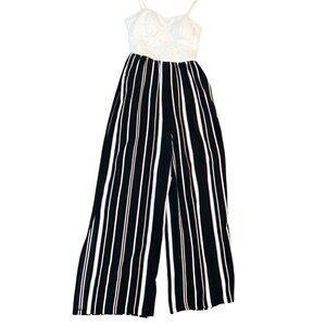 Elevate your wardrobe with this chic jumpsuit featuring a white lace top and contrasting black and white striped palazzo pants. Ideal for those who appreciate a blend of elegance and modernity, this ensemble offers comfort and style in equal measure. A versatile piece for various occasions.