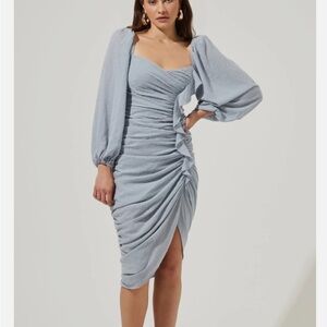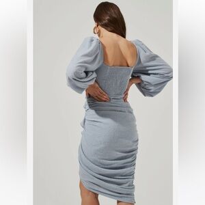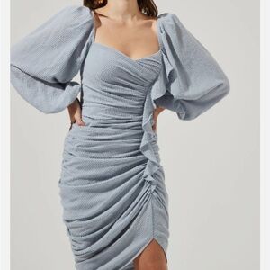 Chic long sleeve dress by Astr. Features a textured design and elegant draping. Perfect for any occasion.