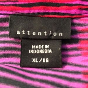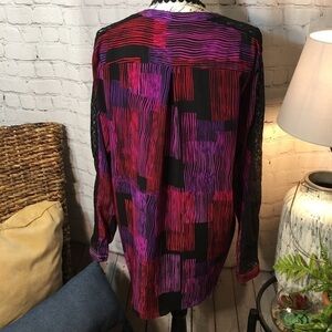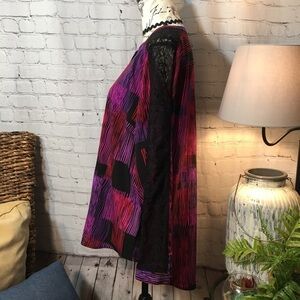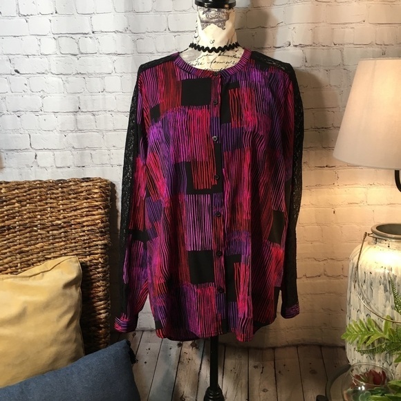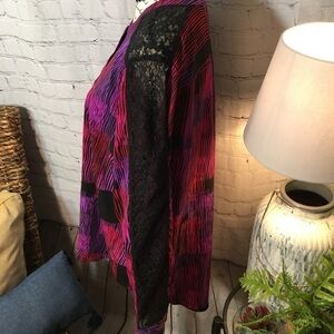 Bright multi colored tan neckline button down front. Long sleeve with black lace from shoulder to cuff. Gently preowned condition.
