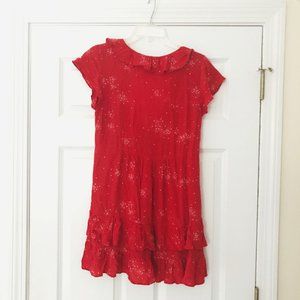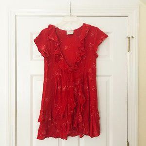🌿 Bright red ruffled mini dress with delicate white star print, faux-wrap front, and decorative neck ties