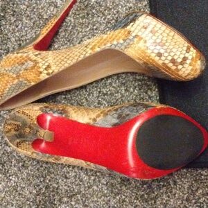 Exterior in perfect condition, gorgeous snakeskin in creams, beiges and muted gorgeous greens. Interior shows signs of use. Toe non-slips added for breezy, easy wear. Size 39, 4in heel. Open to trades for a more platformed toe! Thank you for looking 💗