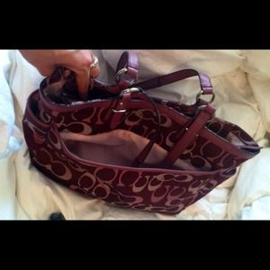 beautiful coach bag! very large, holds all my stuff lol. had two small pockets on sides and one side pocket on the outside. Inside has a zipper pocket and two small pockets.