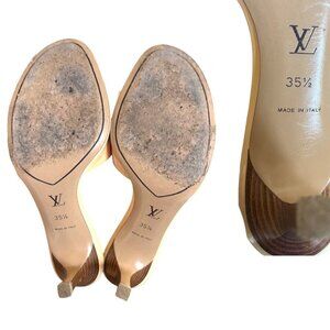 authentic LOUIS VUITTON Nude Beige LV Charm Logo Buckle Kitten Sandals Heels 5.5
