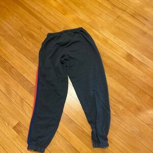 charcoal aviator 5 star sweatpants with neon rainbow stripes down one side, cuffs at bottom of pants, lightly worn